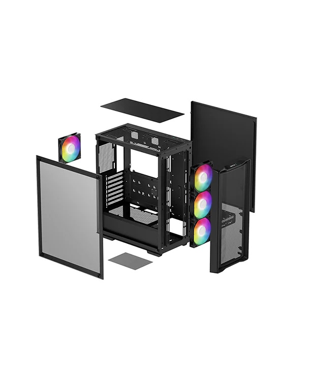 Корпус Deepcool CC560 MESH V2 обеспечивает отличную вентиляцию, благодаря четырём 120-мм ARGB вентиляторам и сетчатой передней панели. Он дополнительно оборудован пылевыми фильтрами, что помогает поддерживать чистоту внутри.